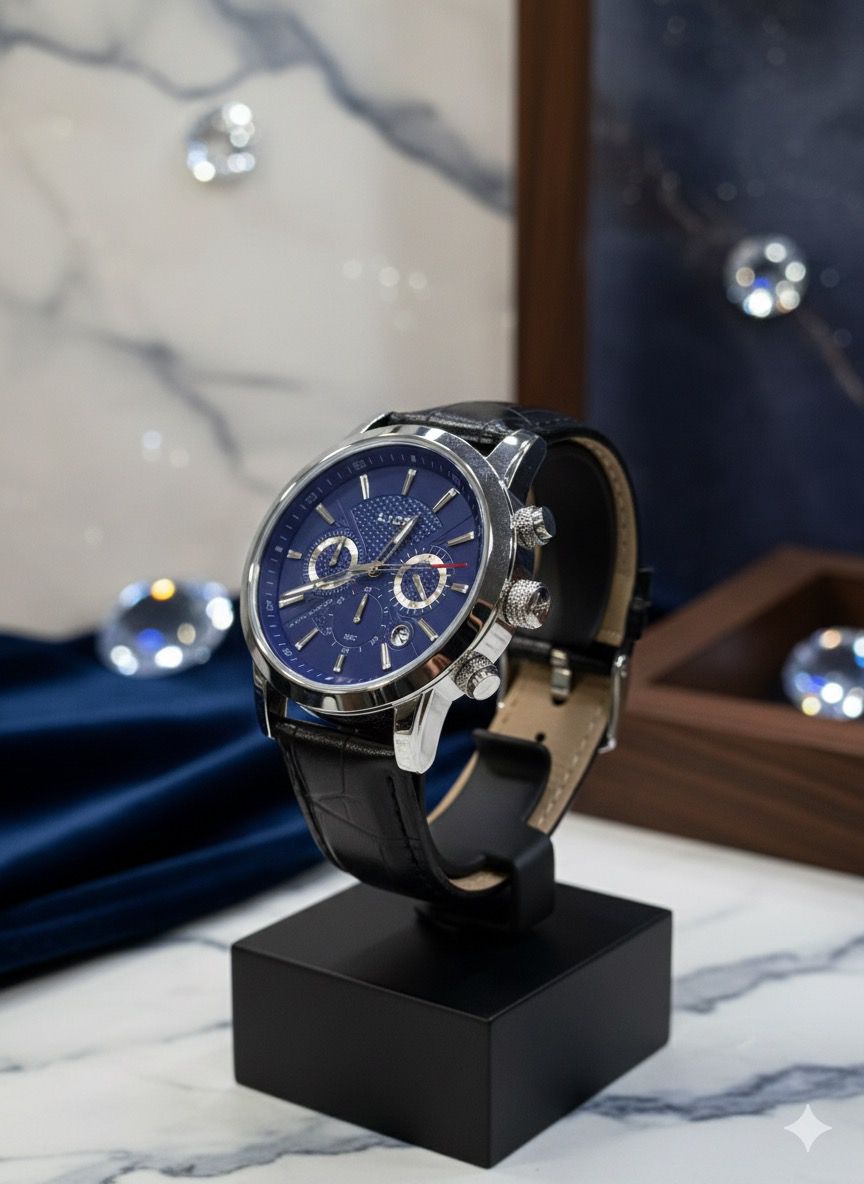 COLOR PLATEADO CON CORREA DE CUERO NEGRO Y CARATULA AZUL